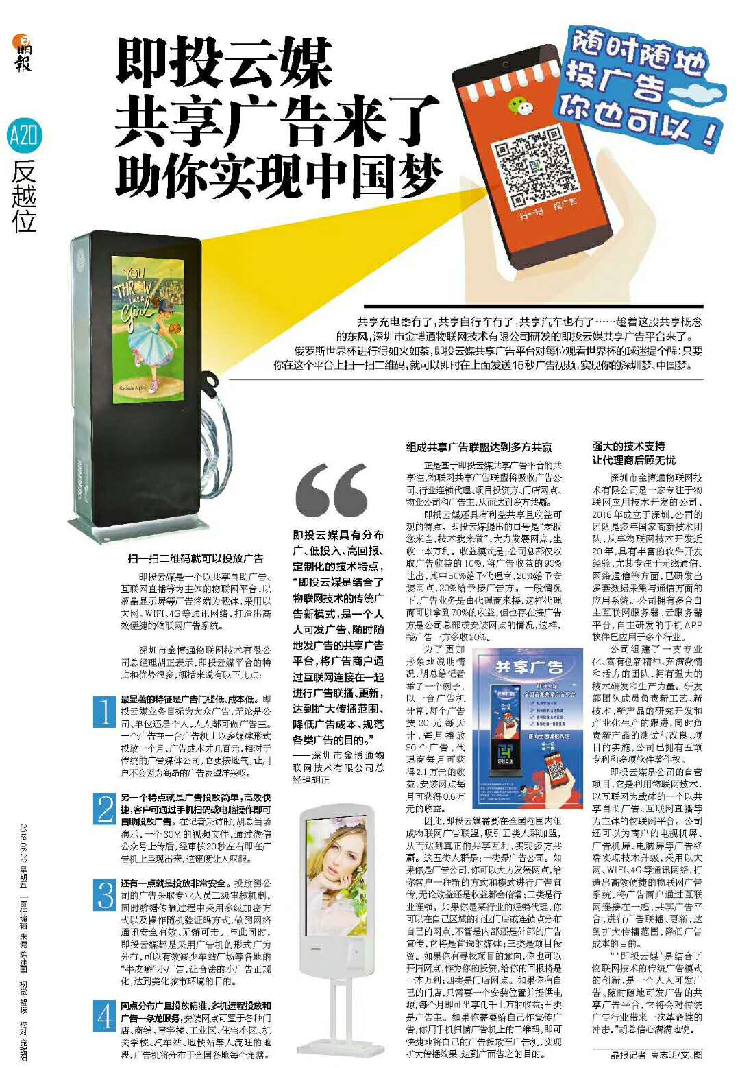 622日《晶報》用了一個整版,以《即投云媒共享廣告來了 助你實現(xiàn)中國夢》報道了即投云媒共享廣告平臺的特點、技術(shù)及共享廣告聯(lián)盟共贏的理念。